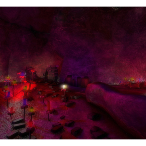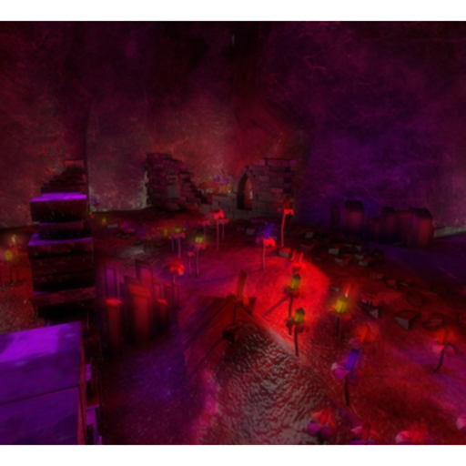 A large mesh cave lite by glowing crystal plants, and magic torches. You'll find some partially destroyed castle and medieval stone walls as well. There are ruins in this cave.