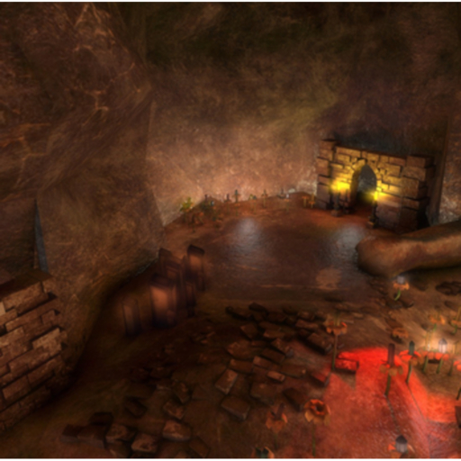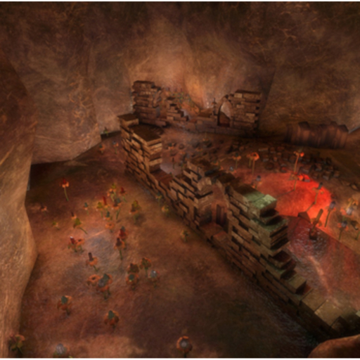 A large mesh cave lite by glowing crystal plants, and magic torches. You'll find some partially destroyed castle and medieval stone walls as well. There are ruins in this cave.