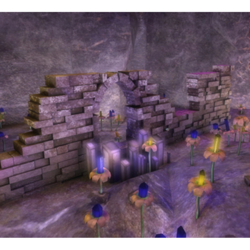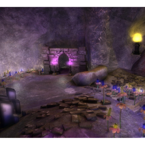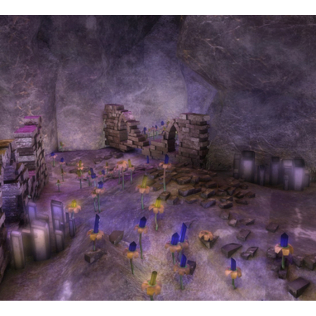 A large mesh cave lite by glowing crystal plants, and magic torches. You'll find some partially destroyed castle and medieval stone walls as well. There are ruins in this cave.