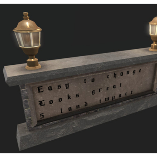 You can change the text on the front of the sign to whatever you want, depend on the size variant of the wall sign. Variants include a 16 character, 3 row version, 16 x 2, 8 x 2, and 8 x1 version. The owner simply stands close to this original mesh landscape wall pillar, touches it, and a dialog pops up where they can input the text for the wall.