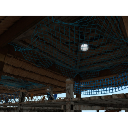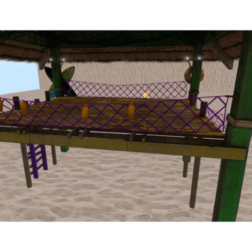A deluxe mesh tiki hut. Includes decorative surf boards, throwable life preserver, and lots of nets. Ceiling fan can be controlled via touch.