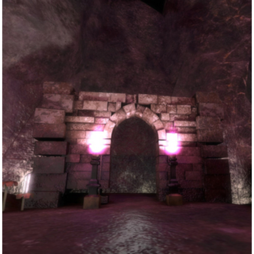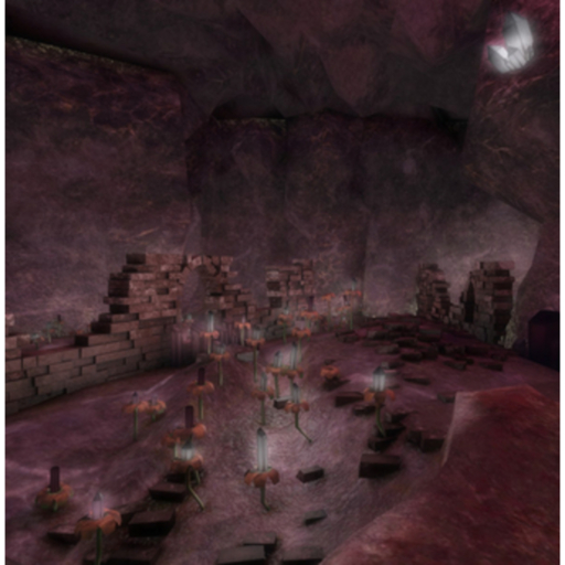 A large mesh cave lite by glowing crystal plants, and magic torches. You'll find some partially destroyed castle and medieval stone walls as well. There are ruins in this cave.