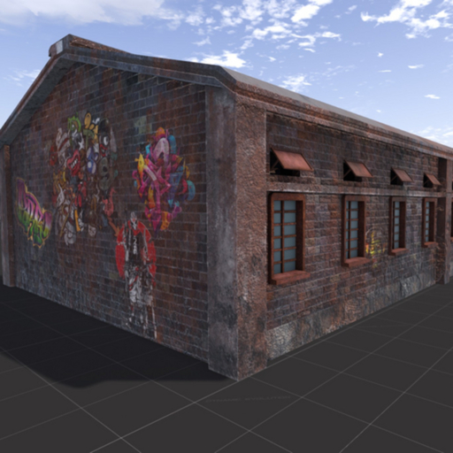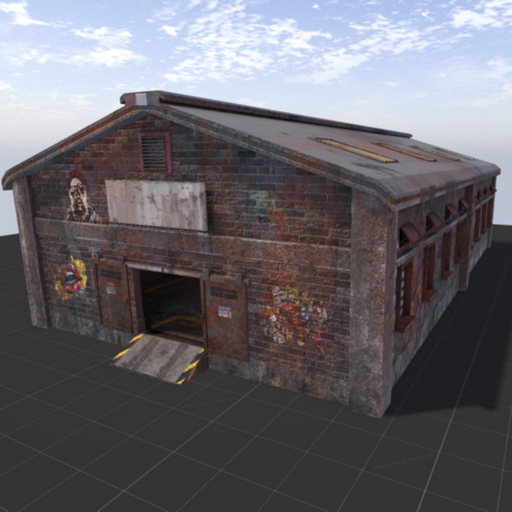 A rectangular footprint ghetto urban warehouse. The interior dimensions are roughly 26x46m. There's one entrance to the building in front, with two sliding doors that open and close on touch.